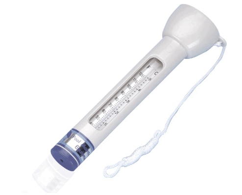Schwimmendes Thermometer zur Messung der Wassertemperatur im Schwimmbad, ergänzt durch eine Schnur zum Befestigen z. B. an Stufen.