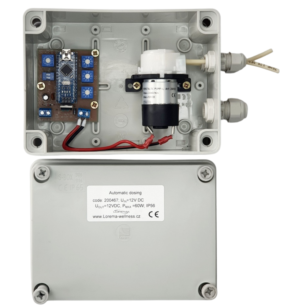 - Verwendung: für die automatische Dosierung von verschiedenen Chemikalien, z.B. Hypochlorit, Essenzen für Dampfbäder oder Saunen usw.