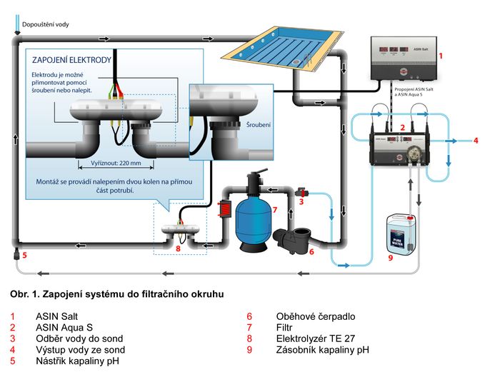 - umožňuje připojení k automatům ASIN Aqua S pro přesné řízení koncentrace volného chloru a pH
