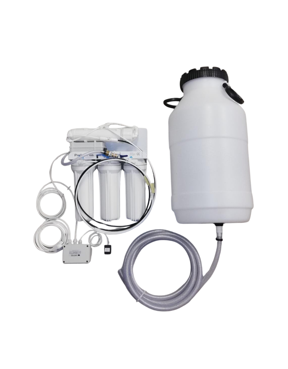 - Sestava je složena z jednotky pro úpravu vody reverzní osmózou, presedimentačním filtrem, I.+ II. + III. uhlíkovými filtry, RO membránou, automatikou řízení, velkokapacitním zásobníkem na 50 l.