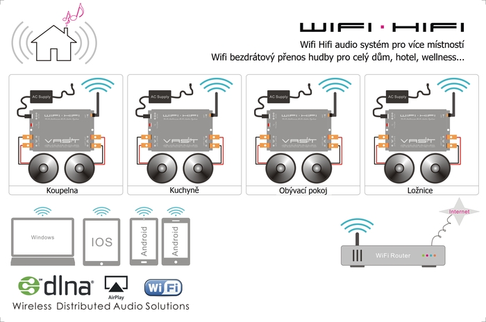 Wireless multi-room hifi audio system that supports DLNA UPnP devices, combination of stereo amplifier with WiIFiI and DSP technology
